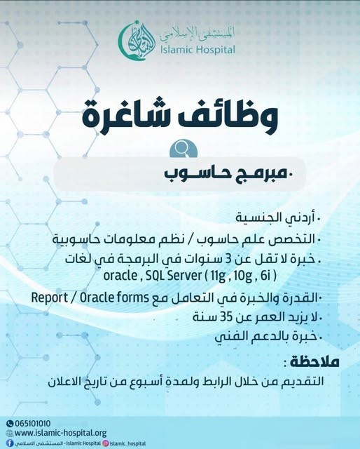 وظائف المستشفى الإسلامي 2026، وظائف مبرمج حاسوب الأردن، وظائف IT في المستشفيات، وظائف أنظمة وتقنيات الأردن، فرص عمل برمجة عمان، فرص عمل برمجة عمان ، تقديم وظائف المستشفى الإسلامي ، وظائف حاسوب الأردن.