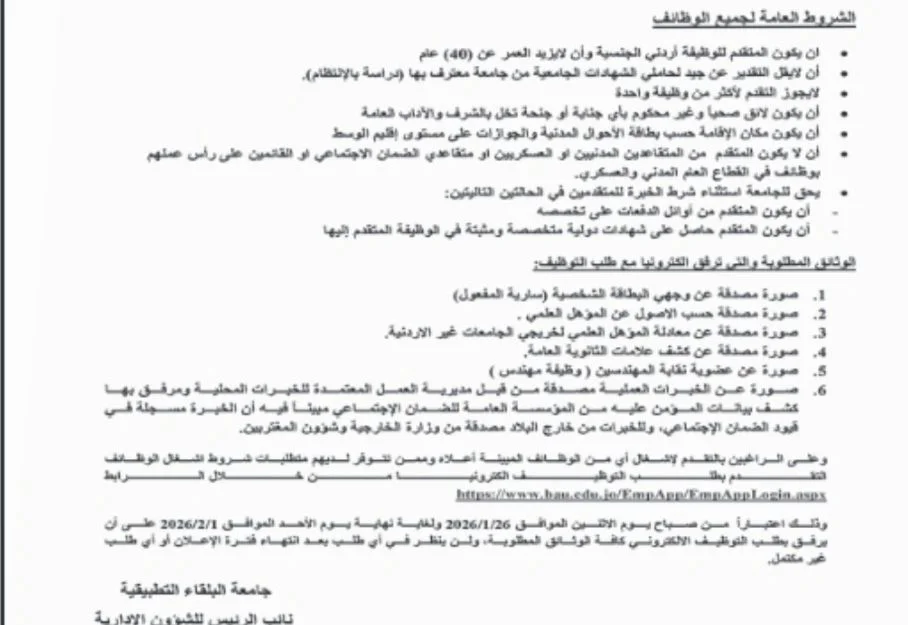 للتقدم إلى وظائف جامعة البلقاء التطبيقية، يجب على المتقدمين الالتزام بالشروط والمتطلبات التي حددتها الجامعة، والتي تختلف حسب كل وظيفة، وتشمل عمومًا: