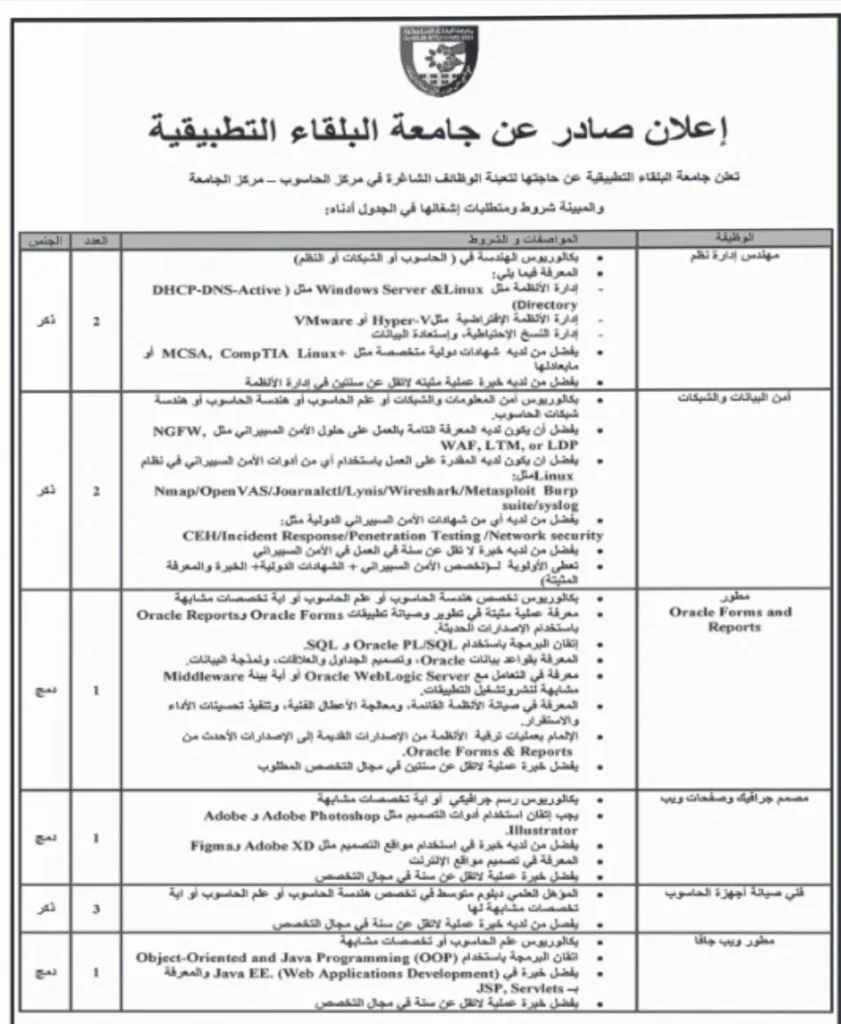 تشمل الوظائف الشاغرة في جامعة البلقاء التطبيقية عددًا من المسميات الوظيفية في المجالات التقنية والحاسوبية، وفق ما هو موضح في إعلان التوظيف المنشور على موقع الجامعة الرسمي.