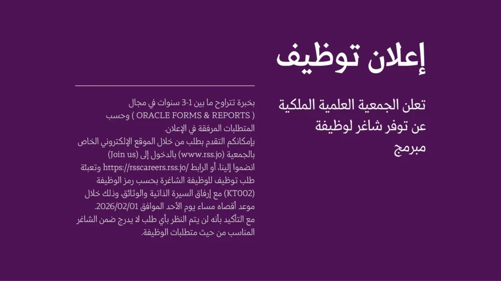 تُعلن الجمعية العلمية الملكية عن توفر شاغر وظيفي بمسمى مبرمج بخبرة تتراوح بين (1–3) سنوات، وذلك ضمن وظائف الجمعية العلمية الملكية 2026 المخصصة للكفاءات التقنية في مجال البرمجة وقواعد البيانات.