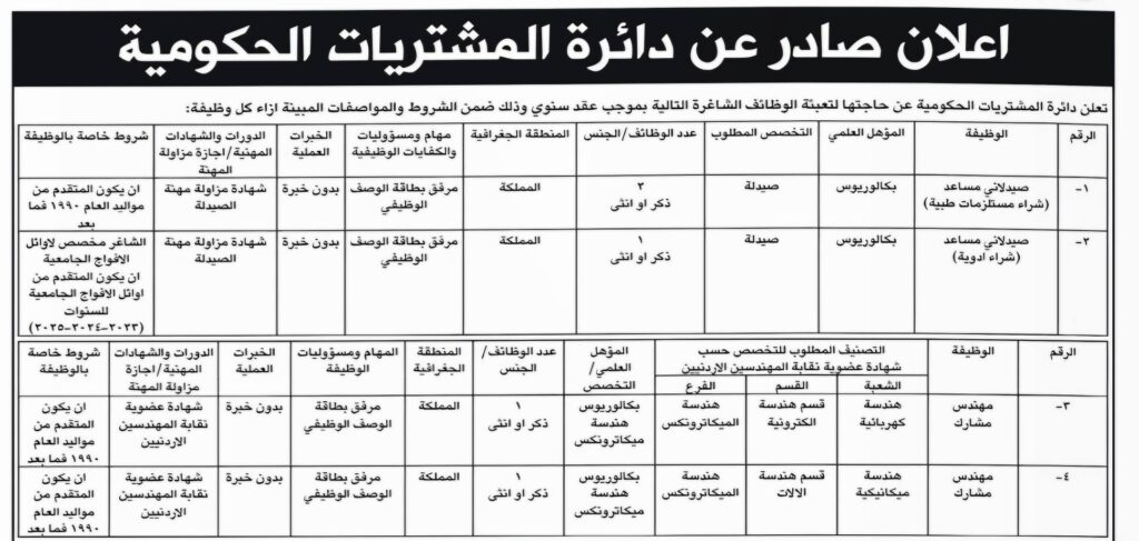 تعلن دائرة المشتريات الحكومية عن فتح باب التوظيف للعام 2026، وذلك لاستقطاب موظفين من الذكور والإناث للعمل ضمن كوادرها في مختلف مناطق المملكة الأردنية الهاشمية.