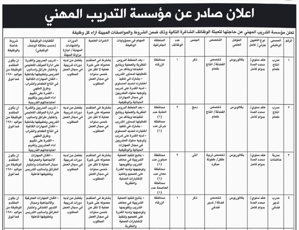 يأتي هذا الإعلان ضمن وظائف مؤسسة التدريب المهني المخصصة للراغبين بالعمل في القطاع الحكومي، وفق الشروط والتعليمات المعتمدة من الجهات الرسمية.