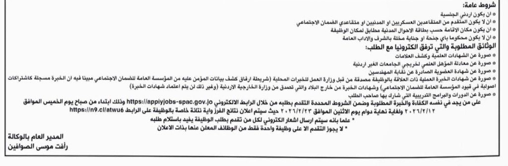 - انتهاء التقديم: نهاية دوام يوم الاثنين الموافق 2029/02/23.