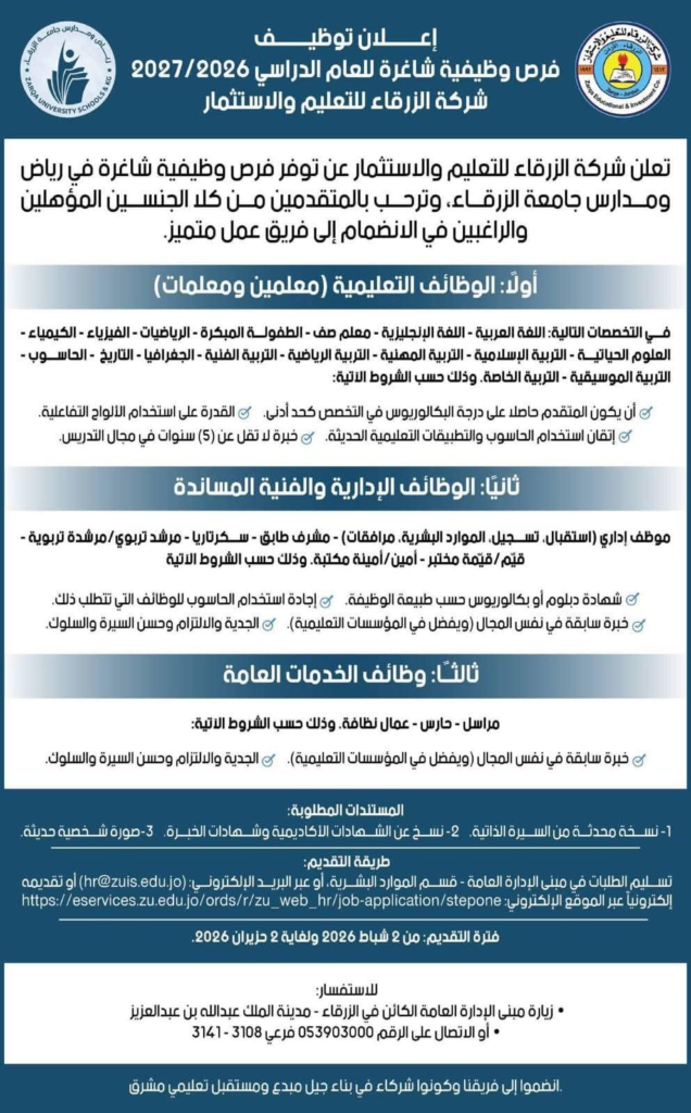 تُعد وظائف مدارس جامعة الزرقاء 2026/2027 فرصة مميزة للراغبين في العمل في القطاع التعليمي أو الإداري في الأردن.
