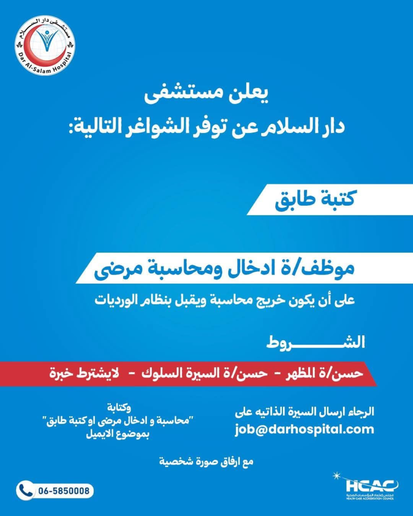 وظائف مستشفيات، وظائف الأردن 2026، وظائف محاسبة، وظائف إدخال بيانات، وظائف طبية إدارية، وظائف بدون خبرة، وظائف مستشفى دار السلام، وظائف عمان، وظائف اليوم، فرص عمل الأردن