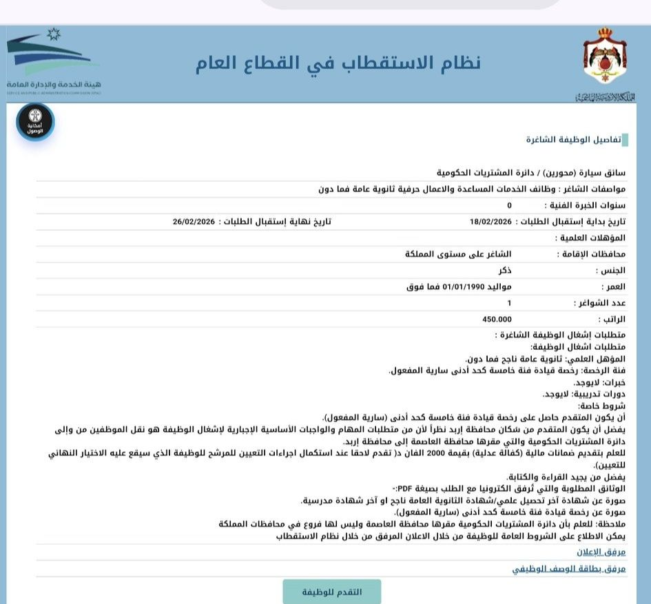 أعلنت دائرة المشتريات الحكومية عن توفر وظائف سائقين حكومية 2026 برواتب تصل إلى 450 دينار أردني، ضمن شواغر رسمية في القطاع الحكومي، مع إمكانية التقديم إلكترونيًا عبر منصة التوظيف الحكومية.