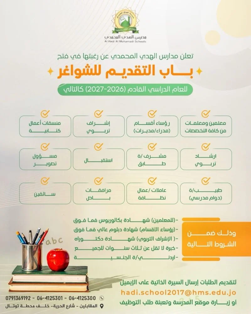 أعلنت مدارس الهدي المحمدي عن فتح باب التقديم ضمن وظائف مدارس الهدي المحمدي 2026-2027، وذلك لعدد كبير من الشواغر التعليمية والإدارية والخدمية، مما يجعلها فرصة مميزة للراغبين بالعمل في القطاع التعليمي في الأردن.