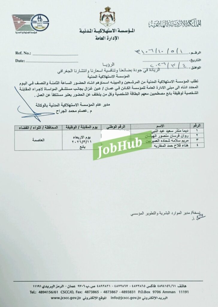 إعلان مقابلات وظائف المؤسسة الاستهلاكية المدنية 2026: مطلوب بائعين في العاصمة عمان