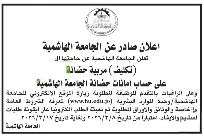 تعلن الجامعة الهاشمية في الأردن، الصرح العلمي العريق، عن فتح باب التعيين لعام 2026 لشاغر مربية حضانة للعمل ضمن كادر حضانة الجامعة المتميز. تعد هذه الفرصة من أهم وظائف الأردن 2026 الموجهة للسيدات الراغبات في الاستقرار الوظيفي والعمل ضمن بيئة تعليمية وحكومية آمنة في محافظة الزرقاء.