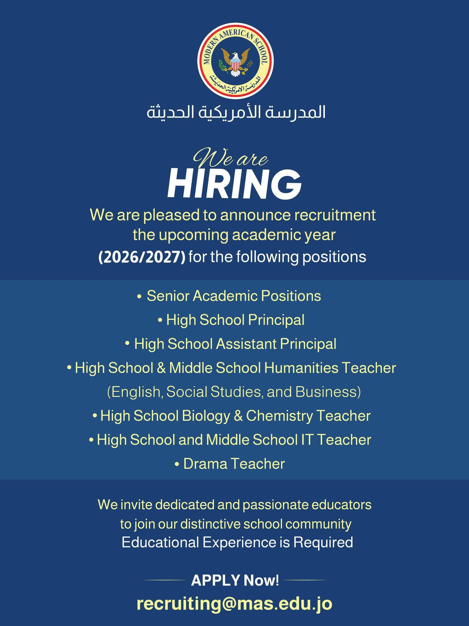 تُعطى الأولوية لأصحاب الخبرة في المناهج الأمريكية، ولكن ترحب المدرسة أيضاً بالخريجين المتميزين ذوي الطموح العالي.
