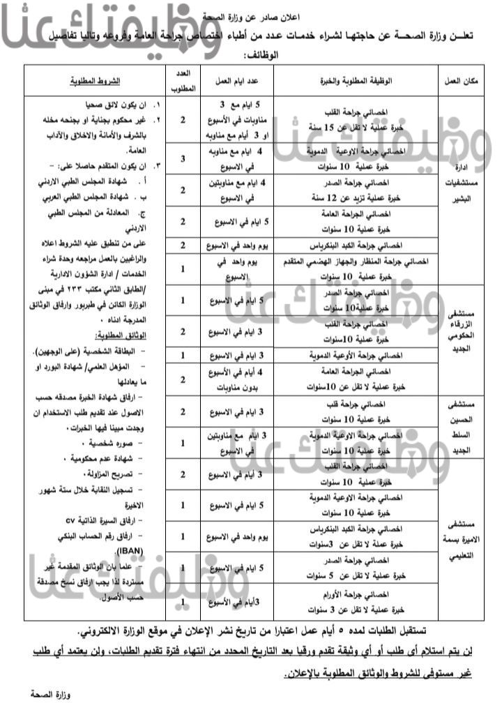 - أخصائي جراحة قلب: خبرة لا تقل عن 15 سنة بعد الاختصاص (عدد 2).
