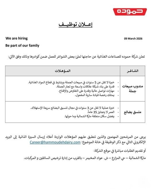 تنبيه ذكي: تعتبر وظائف المبيعات في شركة حمودة من أكثر الوظائف طلباً نظراً لنظام الحوافز المفتوح، لذا يُنصح بإرسال سيرتك الذاتية فوراً قبل اكتمال العدد المطلوب.