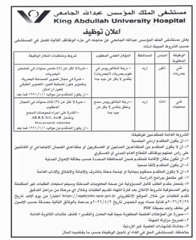 مصدر الوظيفة: إعلان رسمي من مستشفى الملك عبدالله الجامعي – إربد | تم النشر في 26 مارس 2026.