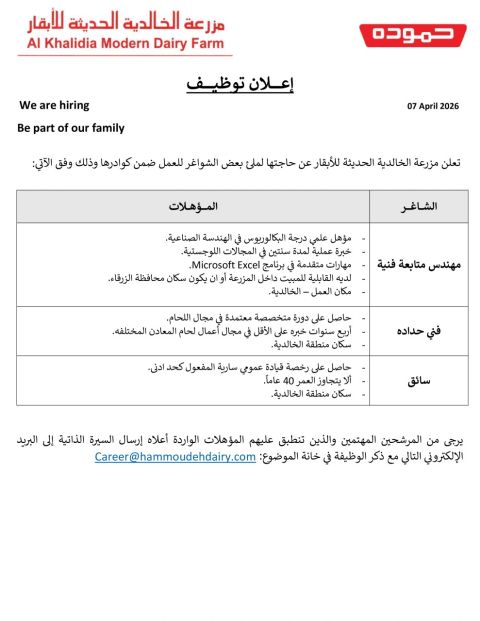 وظائف مزرعة الألبان الحديثة 2026 في الخالدية – شواغر للمهندسين والفنيين والسائقين