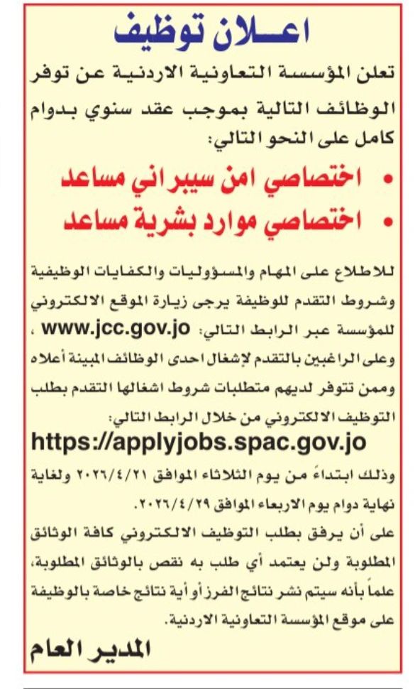 | إعلان توظيف رسمي: المؤسسة التعاونية الأردنية تطلب تخصصات تقنية وإدارية – 2026 |