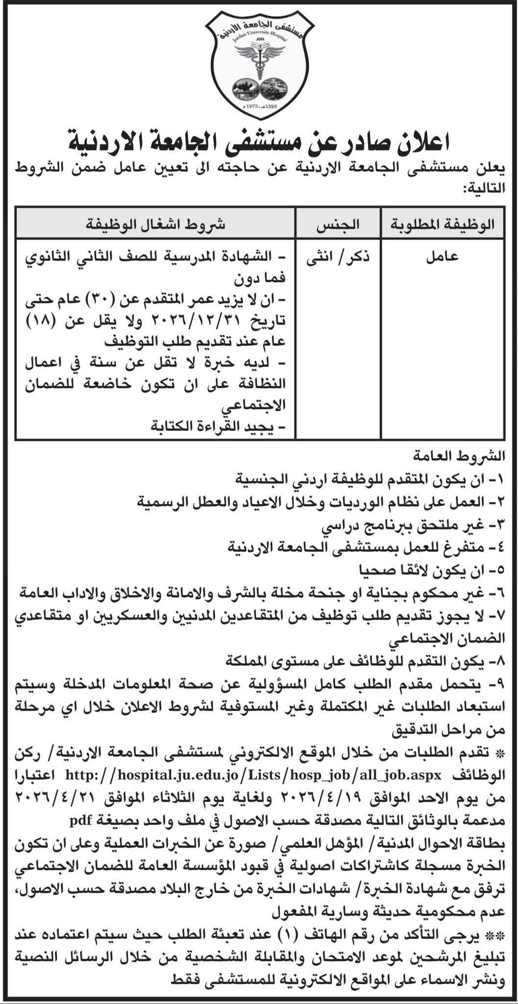 إعلان تعيين “عامل” في مستشفى الجامعة الأردنية – 2026